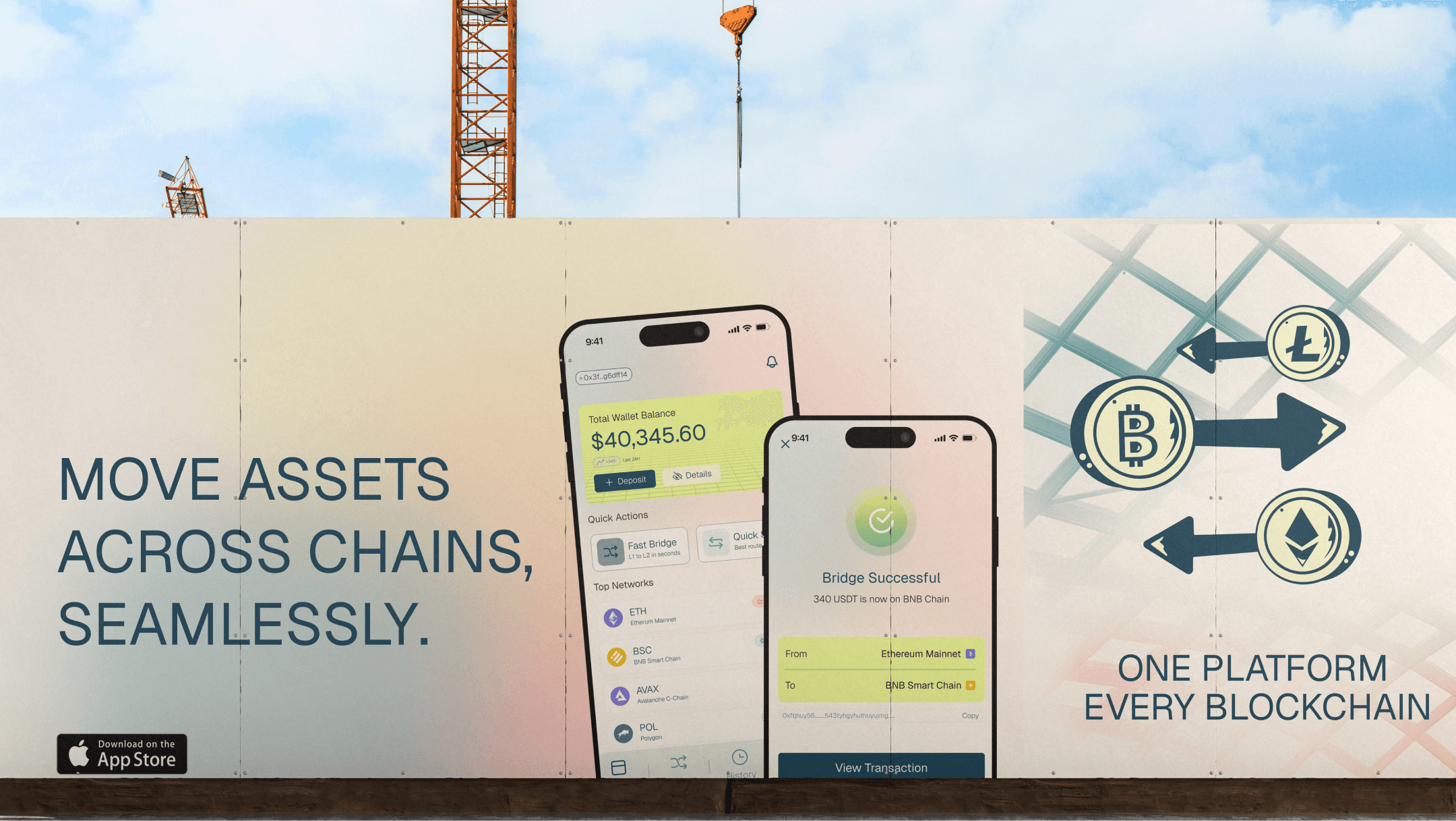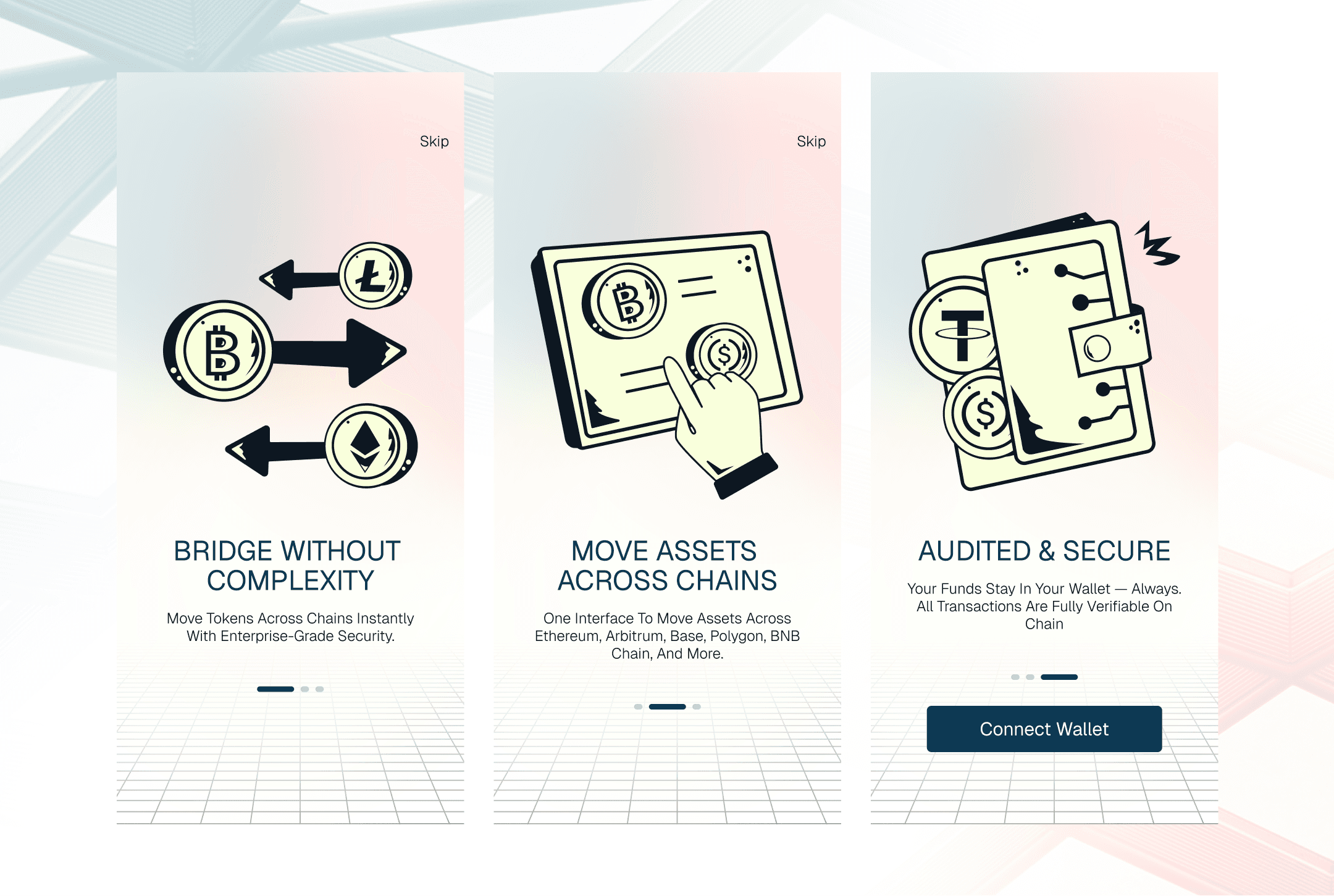 I designed three onboarding screens, each built around a single value proposition: bridge without complexity, move assets across chains, and security you can verify on-chain. Custom illustrations rendered in the brand's navy and lime tones make the onboarding feel editorial rather than templated. The flow closes with a clear "Connect Wallet" CTA.
