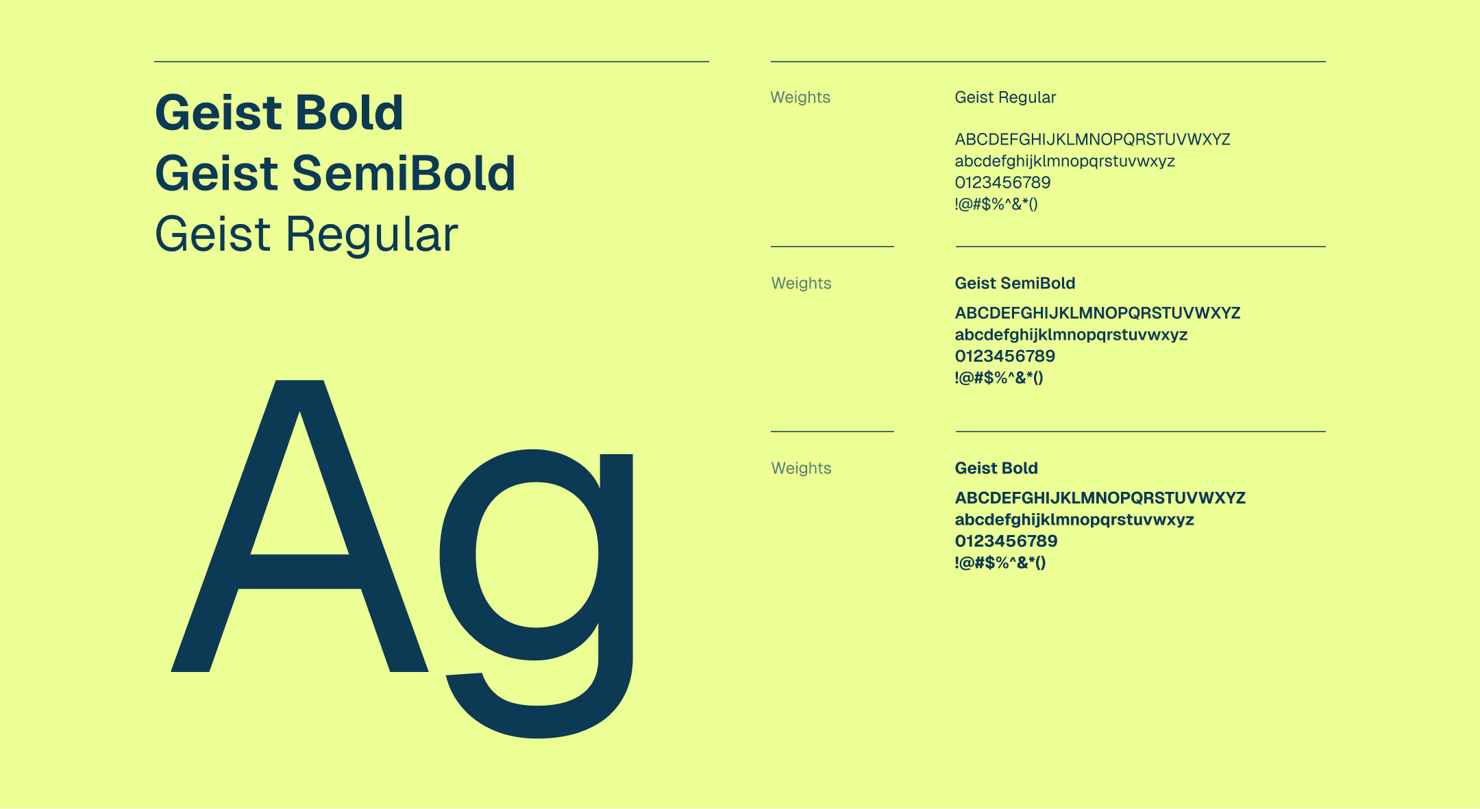 I used Geist (Bold, SemiBold, Regular) for display and brand moments and all UI content. Geist carries the personality and does the work.
