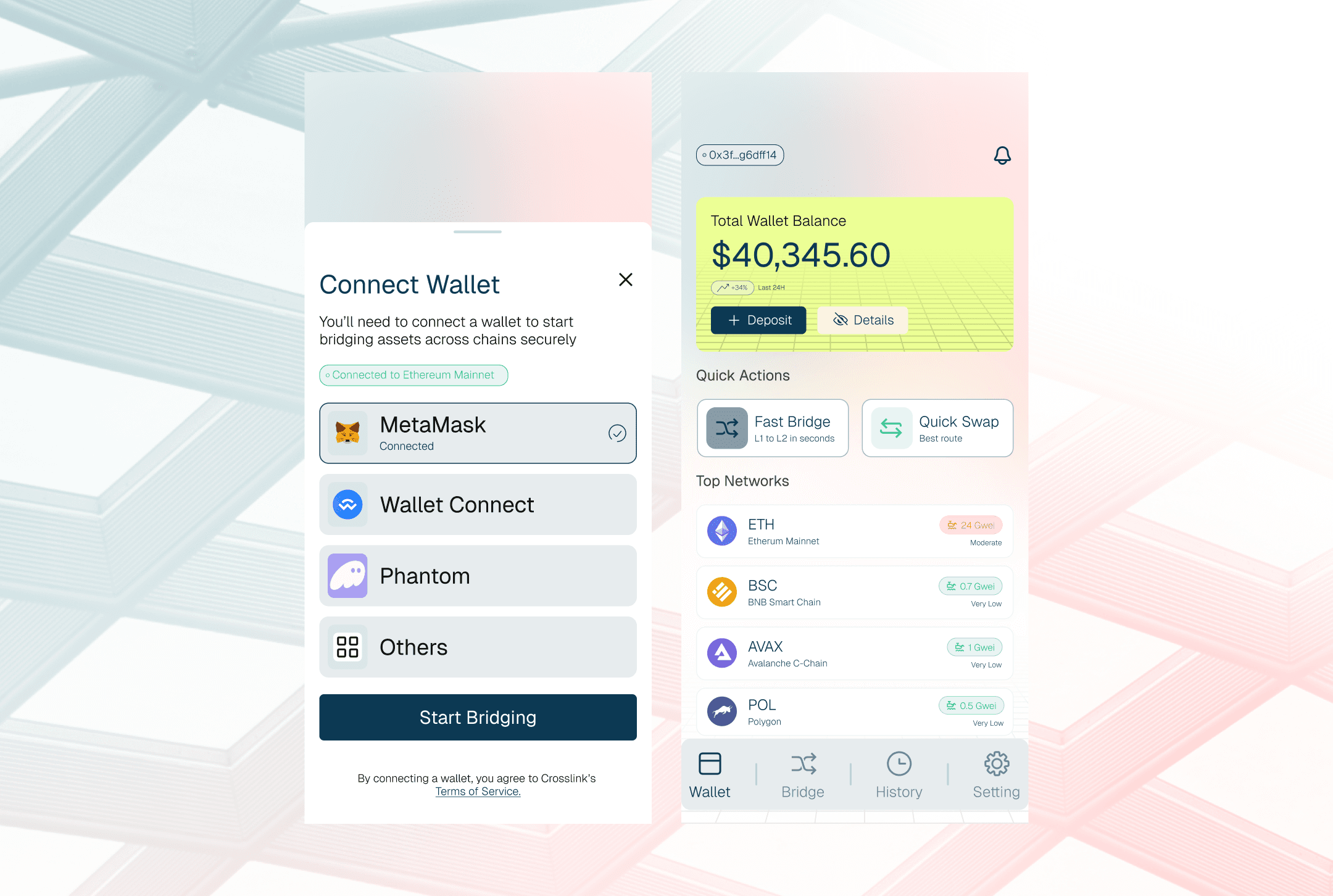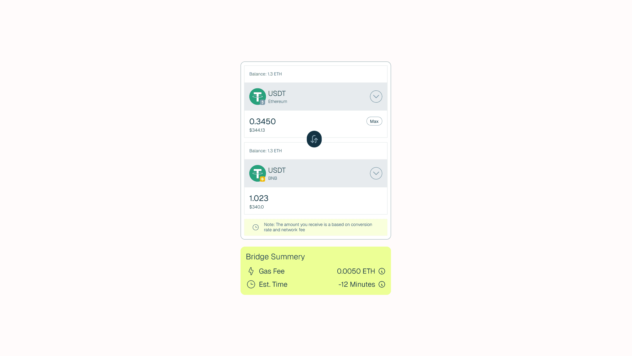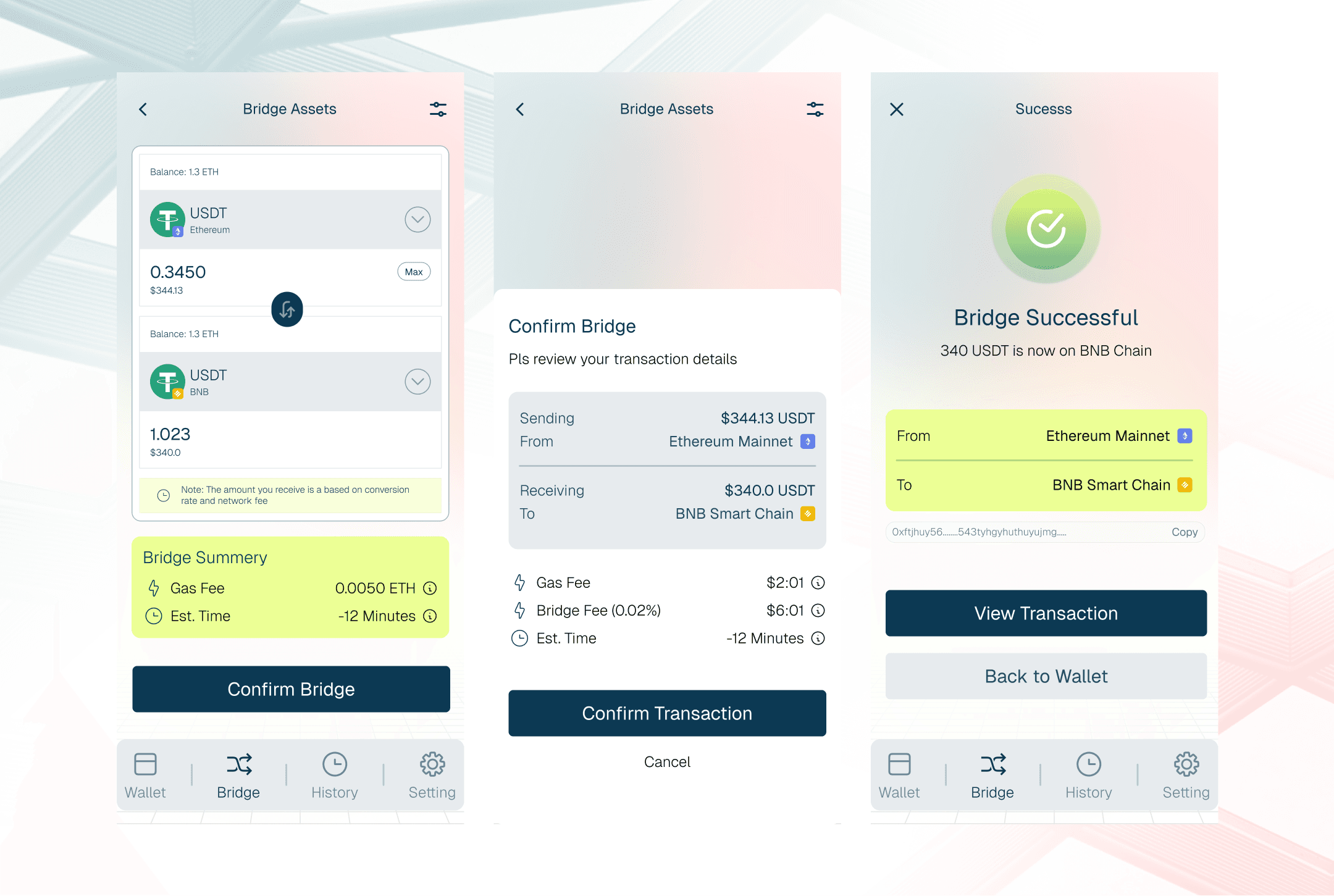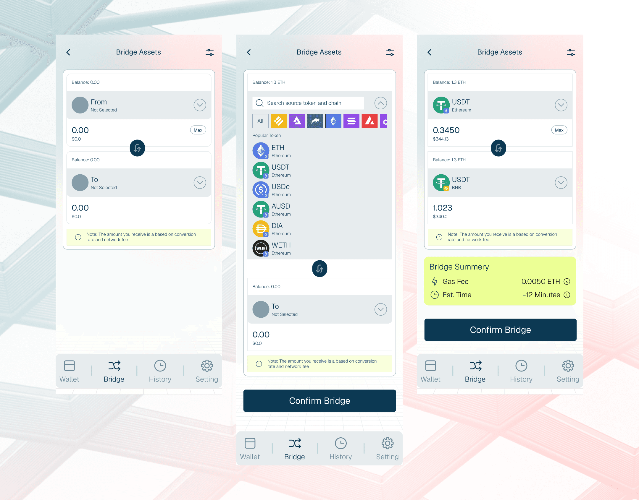 I designed a clear three-step bridge flow: select your tokens and amounts, choose your source chain and token from a searchable list, then review a full breakdown before confirming sending amount, receiving amount, gas fee, bridge fee, and estimated time. Everything a user needs to make a confident decision, in one screen.