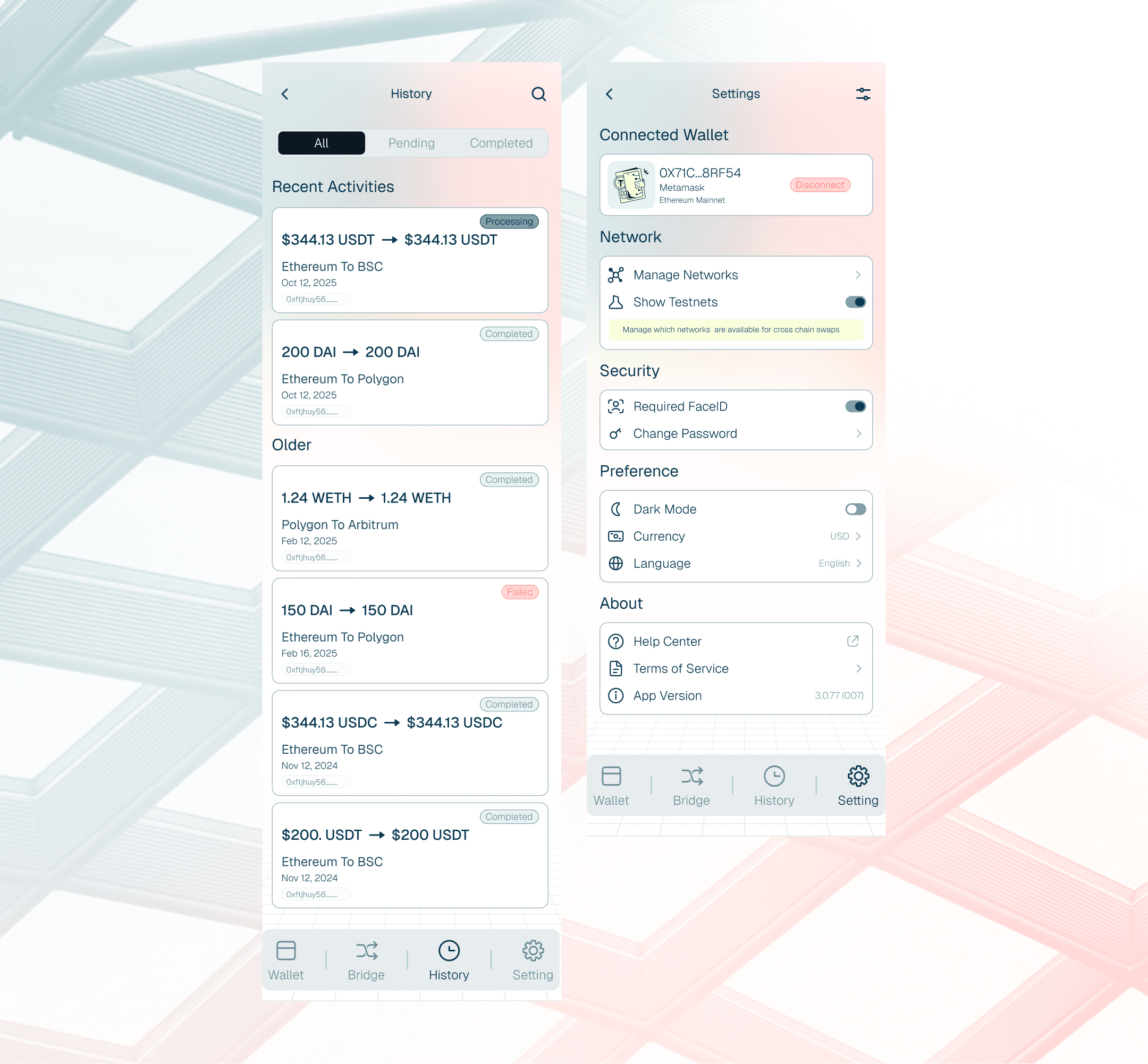 I also designed wallet connection, transaction history with status-coded activity cards (Processing, Completed, Failed), and a settings panel covering network management, security, preferences, and support all organized consistently with the rest of the product.