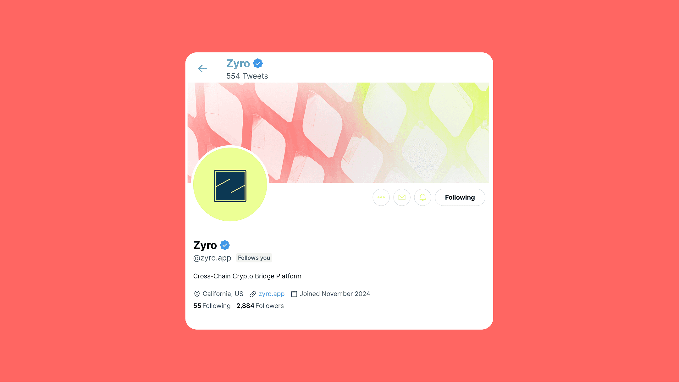 I designed the Zyro mark around a contained square icon with two diagonal lines a geometric abstraction of movement between two points, directly referencing the core product function: assets crossing chains. The deep navy field and electric lime border create a tension that feels both structured and energetic.